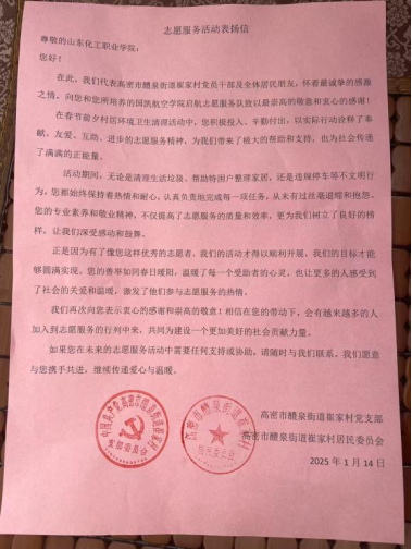 崔家村村委对志愿服务队的到来表示热烈欢迎和衷心感谢。村委负责人在表扬信中写道:在春节前夕的村居环境卫生清理活动中,你们积极投入,辛勤付出,以实际行动诠释了奉献、互爱、互助、进步的志愿服务精神,为我们带来了极大的帮助和支持,也为社会传递了满满的正能量。再次向你们表示衷心的感谢和崇高的敬意,相信在你们在带动下,会有越来越多的人加入到志愿服务的行列中来,共同为建设一个更加美好的社会而贡献自己的力量。