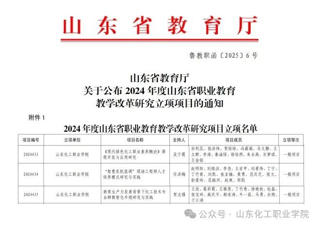 近日,山东省教育厅发布《关于公布 2024 年度山东省职业教育教学改革研究立项项目的通知》(鲁教职函〔2025〕6号),我校申报的《<现代绿色化工职业素养概论>课程开发与应用研究》《“智慧农机装调”现场工程师人才培养模式研究与实践》《新质生产力发展背景下化工技术专业群数智化升级研究与实践》3个项目获批立项。