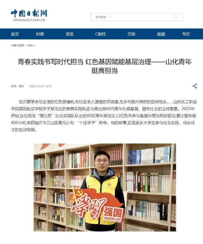我校国凯航空学院23级机场运行服务与管理专业4班学生吴浩达的寒假实践轨迹,勾勒出新时代青年扎根基层、服务社会的立体图景。2025年伊始,这位担任“蒲公英”社会实践队队长的00后青年吴浩达,以红色传承与基层治理为双轮驱动,累计服务超400小时,荣获临沂市兰山区青鸟计划 “十佳学子”称号。他的故事,正是返乡大学生参与社会实践、成长成才的生动写照。3月7日,中国日报网、鲁网报道了吴浩达参加社会实践的相关情况。