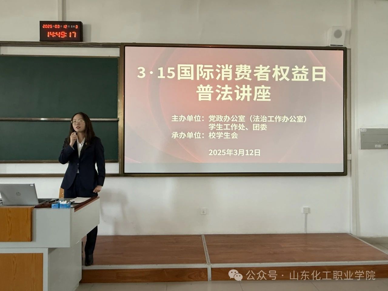 3月12日下午,学校法治工作办公室邀请山东泽中律师事务所律师张媛到校开展“3·15”专题讲座,吸引近200名学生参加,活动由学生工作处处长助理李昂主持。张媛围绕“消费者权益保障”主题,以案说法,系统讲解了消费者的基本权益、消费者权益保障的途径等方面的法律知识,向广大学生传递了主动学法、文明守法、科学用法的重要性。在现场互动环节中,张媛对同学们在学习、生活中遇到的法律困惑和盲点也进行了针对性地答疑解惑,大家纷纷表示受益匪浅。