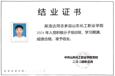 作为一名新时代共青团员,他在思想上始终向党组织看齐。2023年9月,入学后第一时间向党组织递交了入党申请书,思想的进步是行动的指南。同年11月,进入山化院第二期青马工程培训班;2024年4月,推优为入党积极分子;同年5月参加山化院党校培训班学习并获得结业证书。同年6月,获山化院第二期青马工程“优秀学员”荣誉称号。