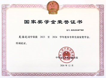 在校学习期间,吴浩达连续3学期学习成绩与综合测评成绩均为专业第一(1/120),获得2023-2024学年国家奖学金、2023-2024学年校级一等奖学金。他始终把学习放在首位,不仅在课堂上认真听讲,课后也积极进行知识的巩固与拓展。学业之余,他非常注重综合素质与基本技能的提升,先后考取了全国计算机二级、普通话等级证书、CEAC技能证书等。同时他也积极参与各类竞赛,将所学的理论知识运用于实践当中,获得第五届“外教社•词达人杯”全国大学生英语词汇能力大赛校赛第一名、国家安全知识竞赛一等奖等多个奖项。