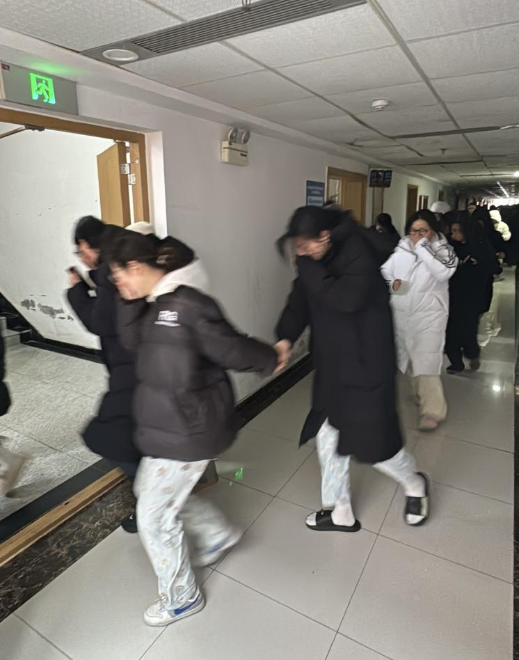 演练中,随着哨声警报响起,应急疏散小组迅速启动预案,各负责人在指定岗位引导学生用湿毛巾捂住口鼻,弯腰贴墙、手扶楼梯扶手,分两列从东西楼梯快速有序撤离,全程杜绝推搡、逗留、使用手机等行为。仅用时数分钟,全体学生便安全疏散至5号楼北侧小广场指定区域,各宿舍舍长立即清点人数并向总指挥汇报应到、实到及请假情况,整个过程紧张有序、规范高效。