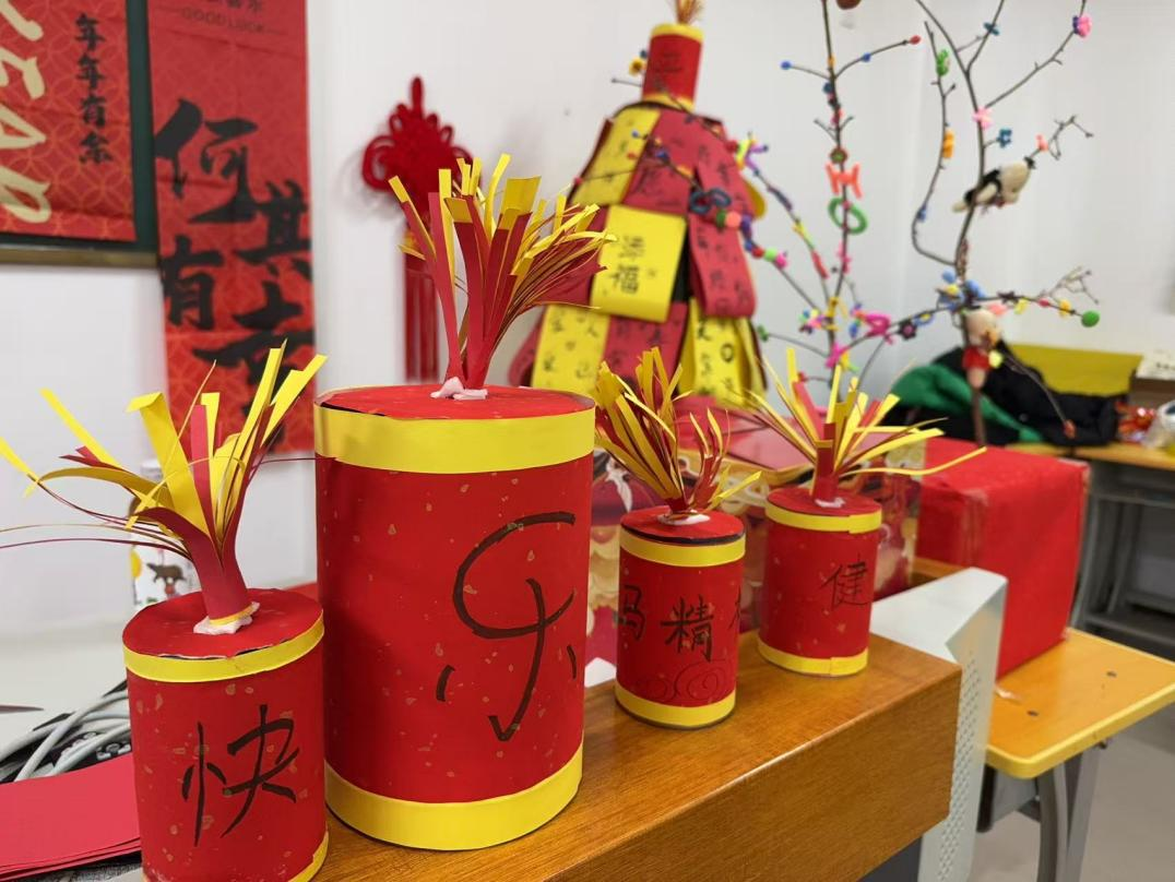 晚会伊始,辅导员赵蓬登台致辞,为同学们送上真挚的新年祝福与殷切期许。为大家逐一送上定制祝愿卡片,并与同学们定下2026年的专属约定:“不旷课、考高分、宿舍卫生比起来”,质朴直白的寄语,满含着对学子们学业进步、生活向好的深切期盼。教室的墙面上,金色的“2026”四字与红红的气球交相辉映,橡皮泥手工花枝缀满真挚的祝福,马年中国结与卡通画相映成趣,手工鞭炮背景板上,辅导员的暖心寄语熠熠生辉。每一处精心布置的细节,都凝聚着班级的向心力与同学们的创造力,勾勒出温馨和谐的集体画卷。