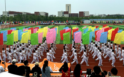 由96名学生组成的彩旗方阵,他们手持五彩斑斓的旗帜,以矫健的身姿和协调的动作,步入会场,走过主席台,在操场上穿梭、列队。彩旗在风中 飘扬,五颜六色交织在一起,宛如一幅幅变幻莫测的画卷,更似一道道流动的彩虹,彰显着无限生机与活力。彩旗队的队员们用他们的热情和活力,为运动会注入了更多的青春元素。