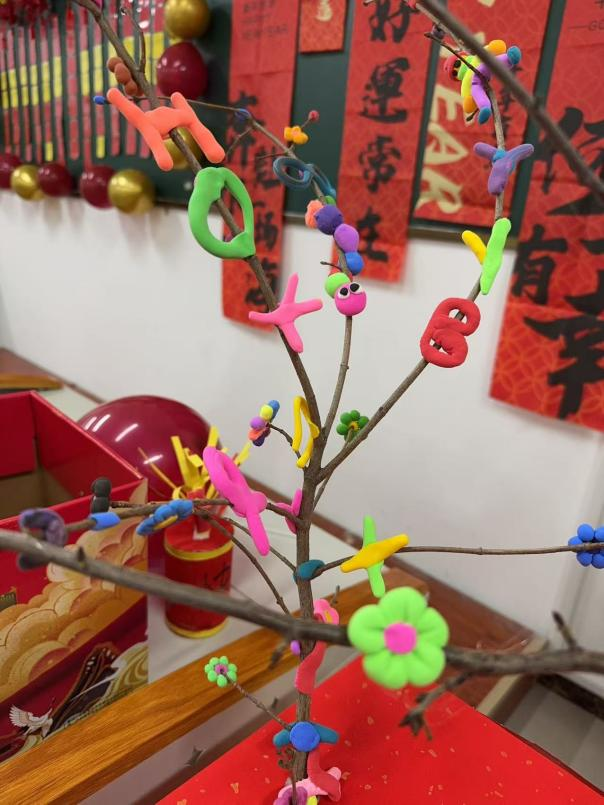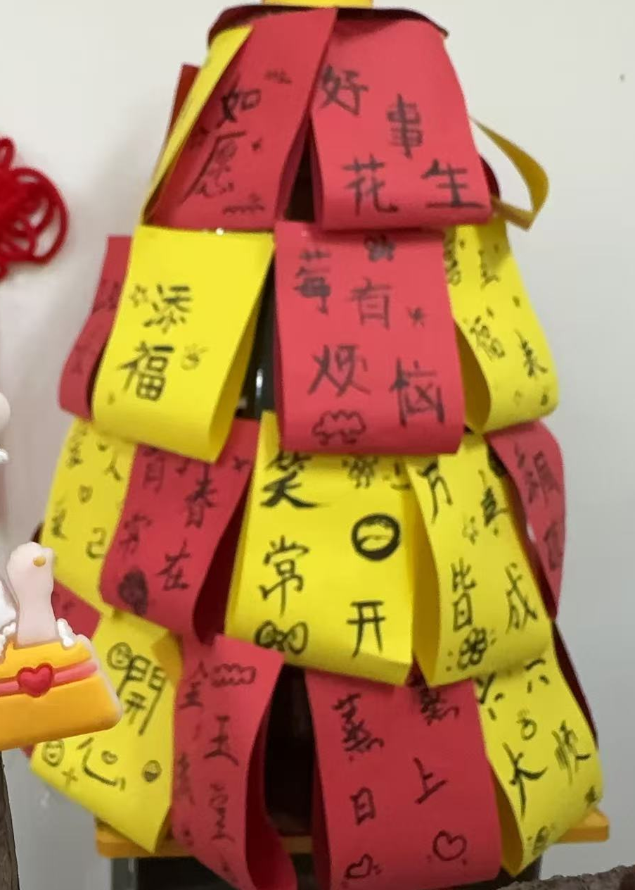 晚会伊始,辅导员赵蓬登台致辞,为同学们送上真挚的新年祝福与殷切期许。为大家逐一送上定制祝愿卡片,并与同学们定下2026年的专属约定:“不旷课、考高分、宿舍卫生起来”,质朴直白的寄语,满含着对学子们学业进步、生活向好的深切期盼。教室的墙面上,金色的“2026”四字与红红的气球交相辉映,橡皮泥手工花枝缀满真挚的祝福,马年中国结与卡通画相映成趣,手工鞭炮背景板上,辅导员的暖心寄语熠熠生辉。每一处精心布置的细节,都凝聚着班级的向心力与同学们的创造力,勾勒出温馨和谐的集体画卷。