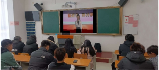 图为线上学习阶段(2023年11月)学生们利用晚自习时间观看普法视频