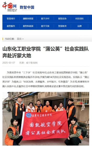 我校国凯航空学院“蒲公英”社会实践队利用寒假奔赴临沂市多地,开展为期14天的社会实践活动。实践队以“蒲公英计划”为载体,以“社区治理、志愿服务、乡村振兴、红色教育”为主线,将课堂所学融入实践中去,充分彰显我校学子的家国情怀与担当。3月7日,“中国网”报道了团队社会实践相关情况。