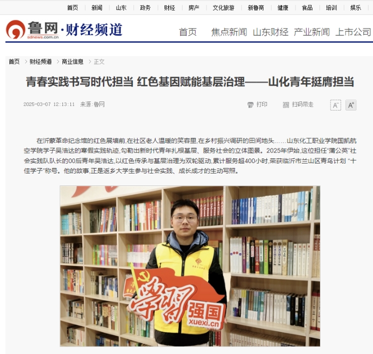 我校国凯航空学院23级机场运行服务与管理专业4班学生吴浩达的寒假实践轨迹,勾勒出新时代青年扎根基层、服务社会的立体图景。2025年伊始,这位担任“蒲公英”社会实践队队长的00后青年吴浩达,以红色传承与基层治理为双轮驱动,累计服务超400小时,荣获临沂市兰山区青鸟计划 “十佳学子”称号。他的故事,正是返乡大学生参与社会实践、成长成才的生动写照。3月7日,中国日报网、鲁网报道了吴浩达参加社会实践的相关情况。