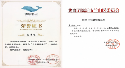 吴浩达连续两年参加青鸟计划,2025年2月,获评临沂市兰山区“十佳青鸟学子”荣誉称号;其创作日常工作Vlog视频被共青团临沂市兰山区委视频号投放,浏览量过万。作为项目组织者的他,还组织策划了2025年临沂市兰山区青年春节联欢晚会。