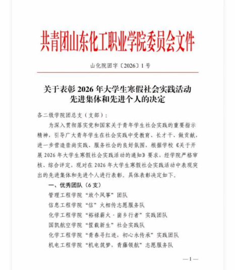 近日,山东化工职业学院对2026年大学生寒假社会实践活动进行了表彰,国凯航空学院硕果满载、再创佳绩。学院“筐载新生”社会实践队获评校级优秀实践团队,指导教师迟健荣获校级优秀指导老师,赵润泽等13名同学获评校级社会实践先进个人,充分彰显了学院学子扎根基层、知行合一、勇担使命的青春风采。